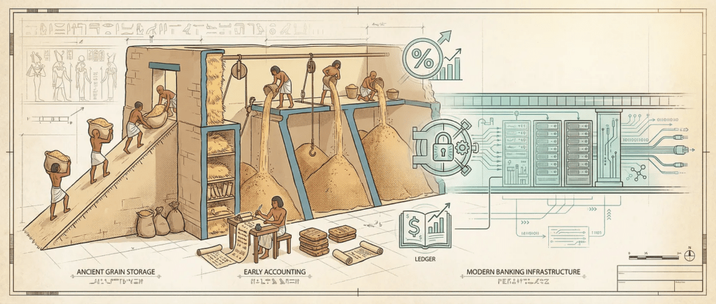 The silo was the bank vault. The clay tablet was the bank statement. The temple accountant was the loan officer. The entire financial system was built on stored agricultural output.