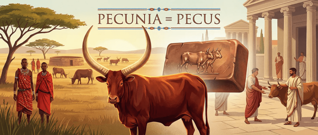 In Rome, the word for money, pecunia, literally means cattle. Fines were paid in livestock. State wealth was measured in herds. The crime of embezzling public funds was called peculatus: cattle theft.​