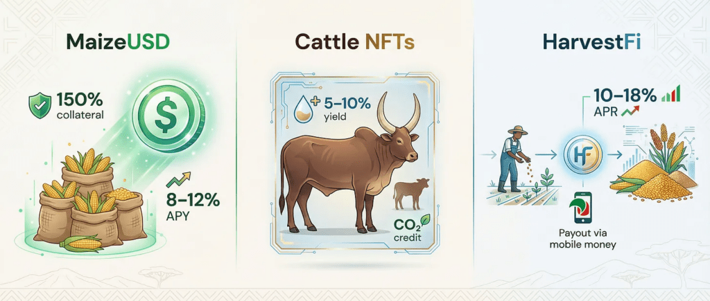 A dollar-pegged stablecoin over-collateralized by tokenized maize from Kenya’s e-WRS warehouses. 150% collateral ratio. Oracle price feeds from KOMEX. Weather-indexed insurance for climate risk. Yield from seasonal price appreciation (maize typically rises 15 to 30% from harvest to pre-harvest) plus DeFi lending income. Target: 8 to 12% annualized yield.