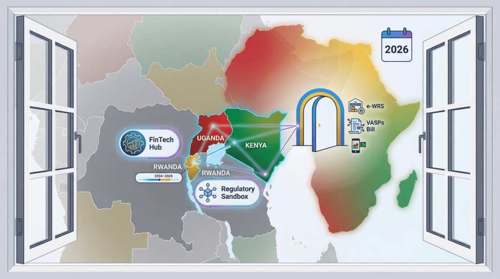 Kenya: The e-WRS is government-backed infrastructure. The VASPs regulatory framework is in development after been passed into law in late 2025. The CMA has a regulatory sandbox. M-Pesa provides last mile rails for instant on-ramp/off-ramp.